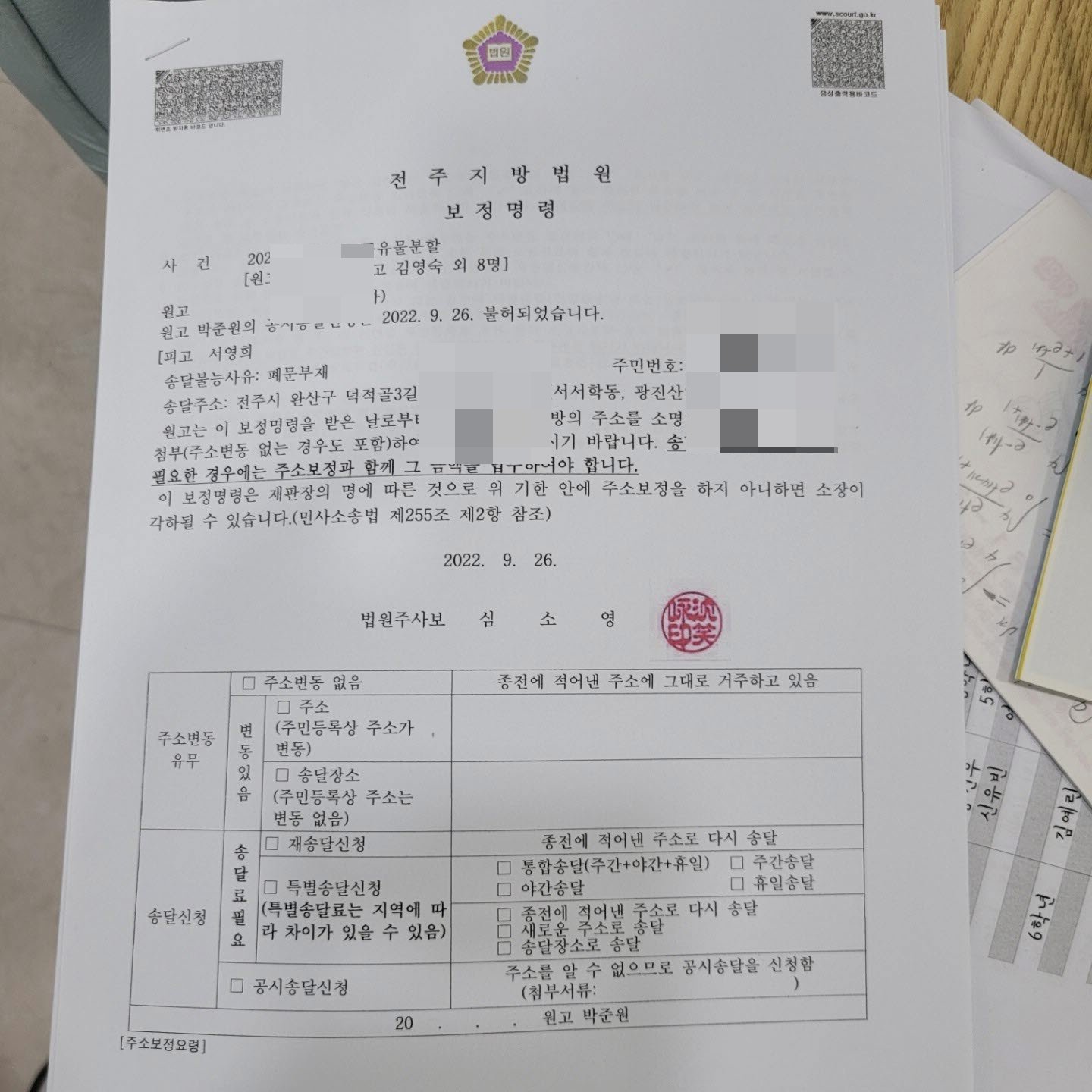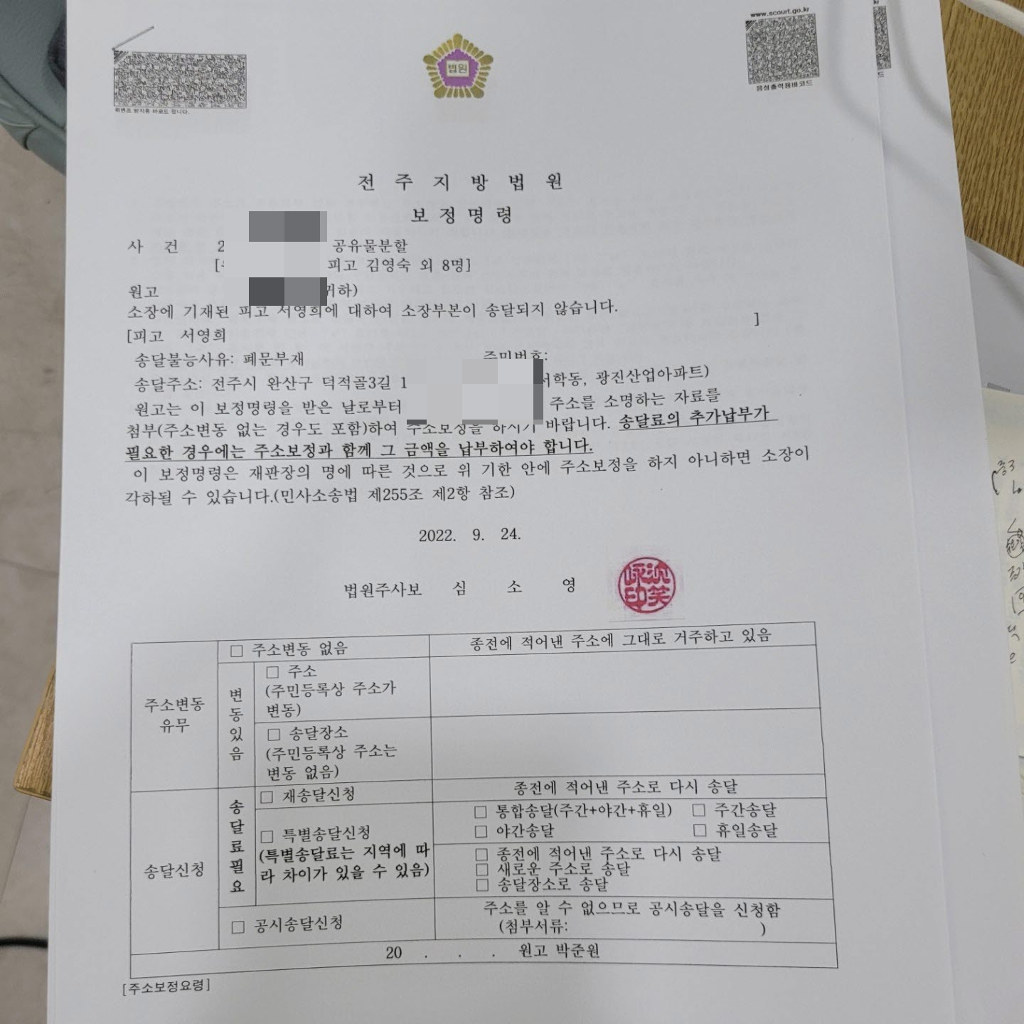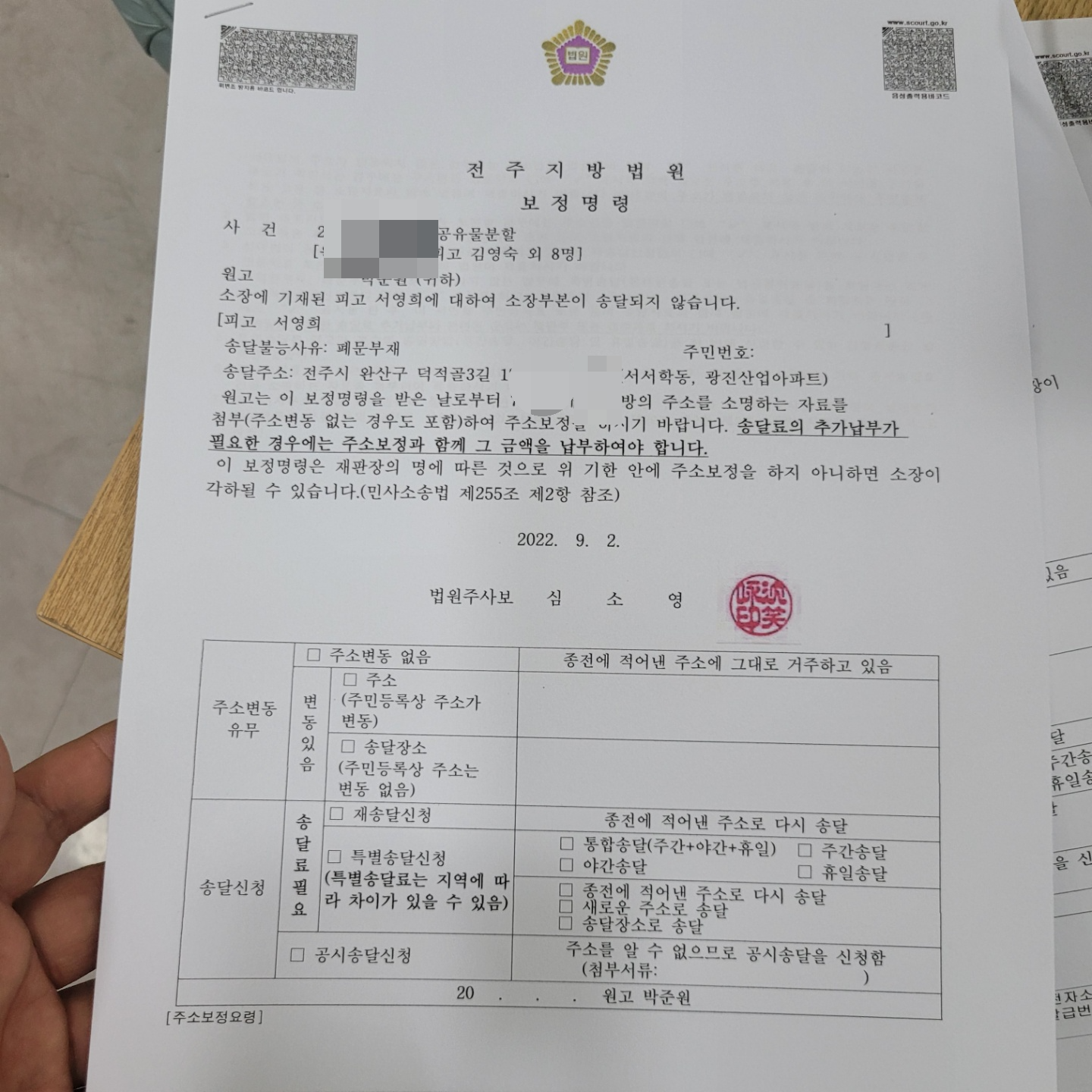 9월 2일에 서영희 씨에 대한 주소보정명령등본을 받았다.