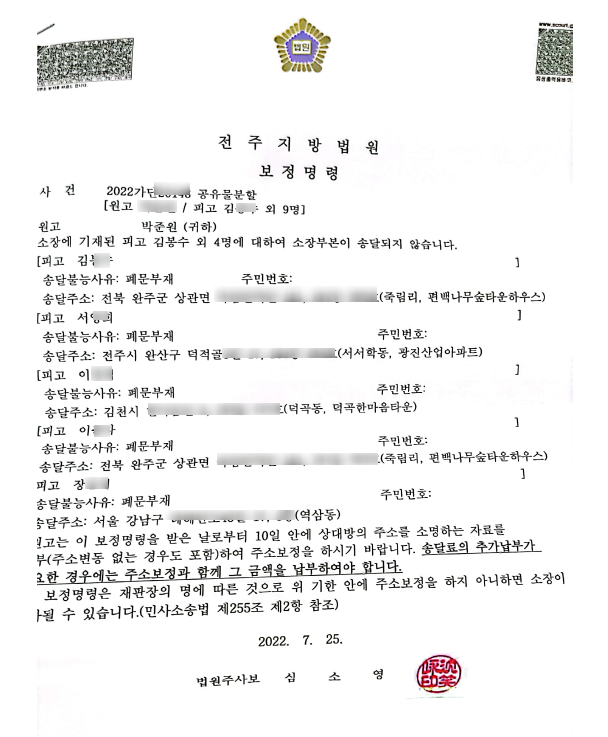 다시 주소를 보정하니 다른 4분에게는 송달이 됐고