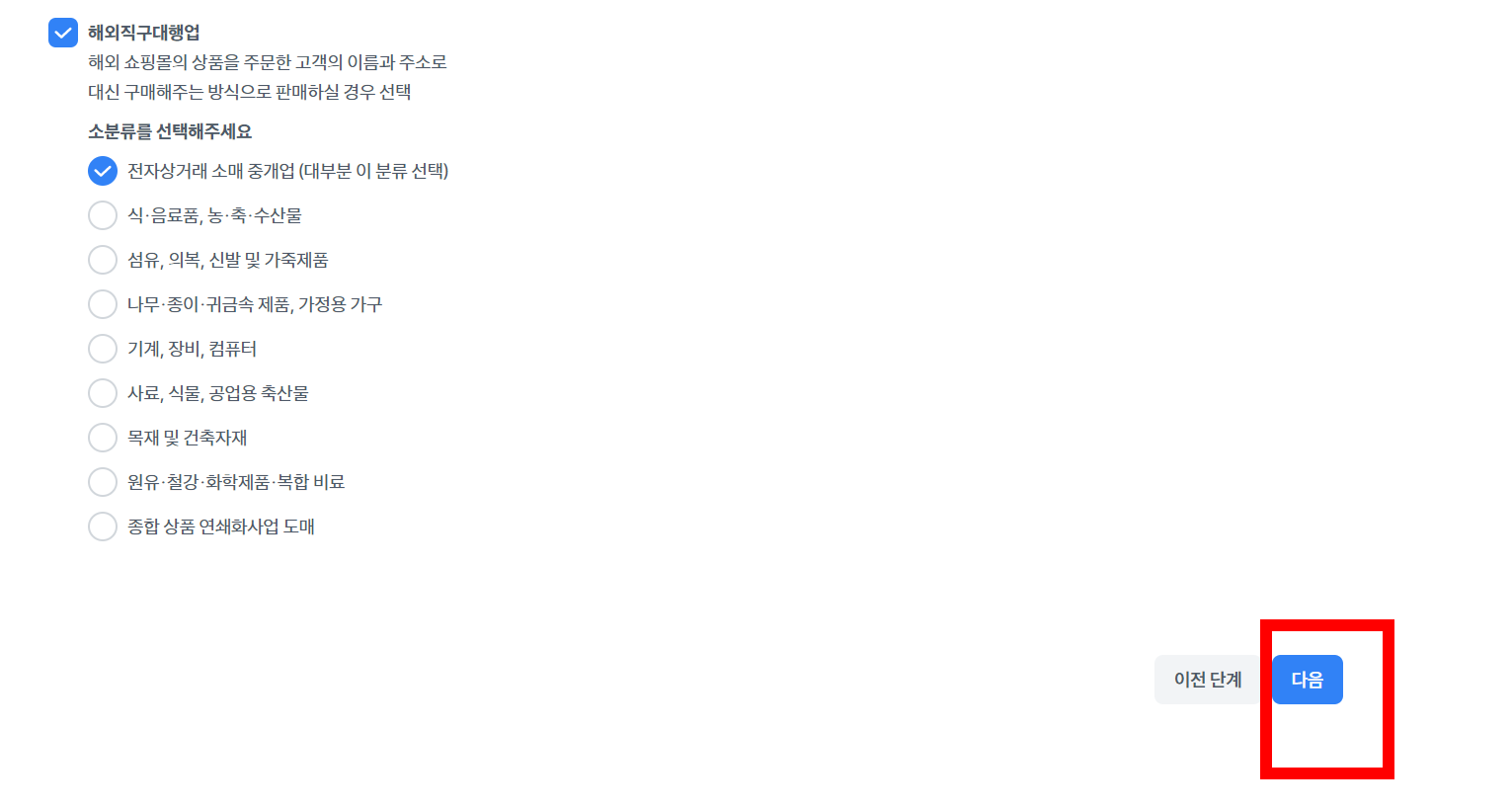 해외직구대행업을 선택하고 전자상거래 소매 중개업을 선택한다.
