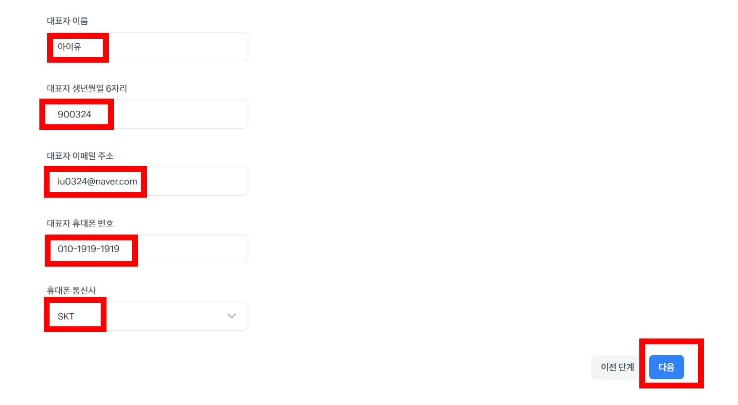대표자 인적사항 등을 기재하고 다음을 누른다.