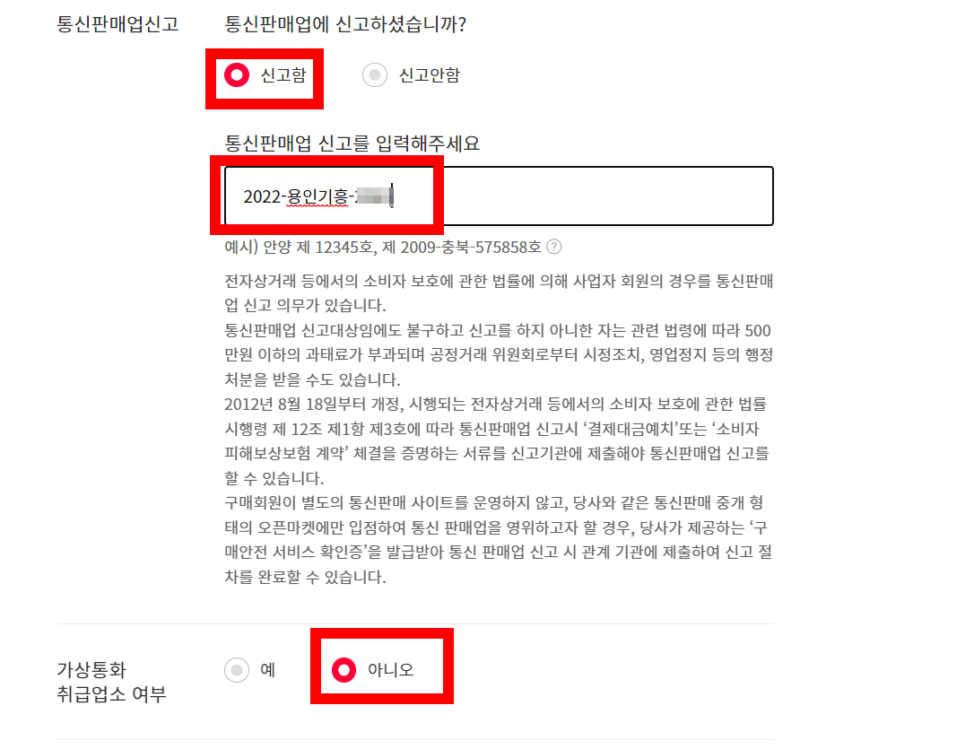 통신판매 신고번호를 기입하고 가상통화 취급업소 여부는 아니오를 체크한다.