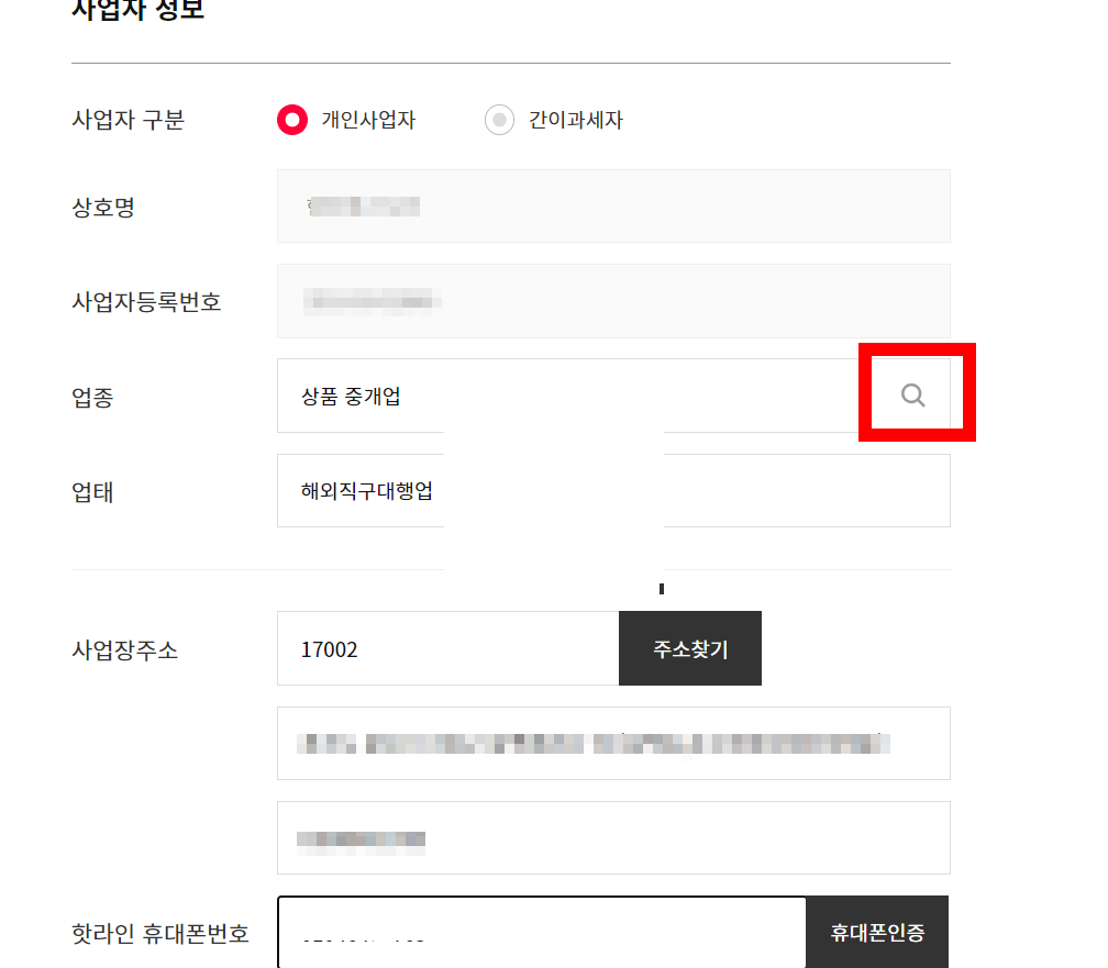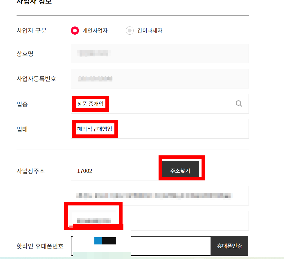 업태는 해외직구대행업으로 선택한 후 핫라인 휴대폰인증을 한다.