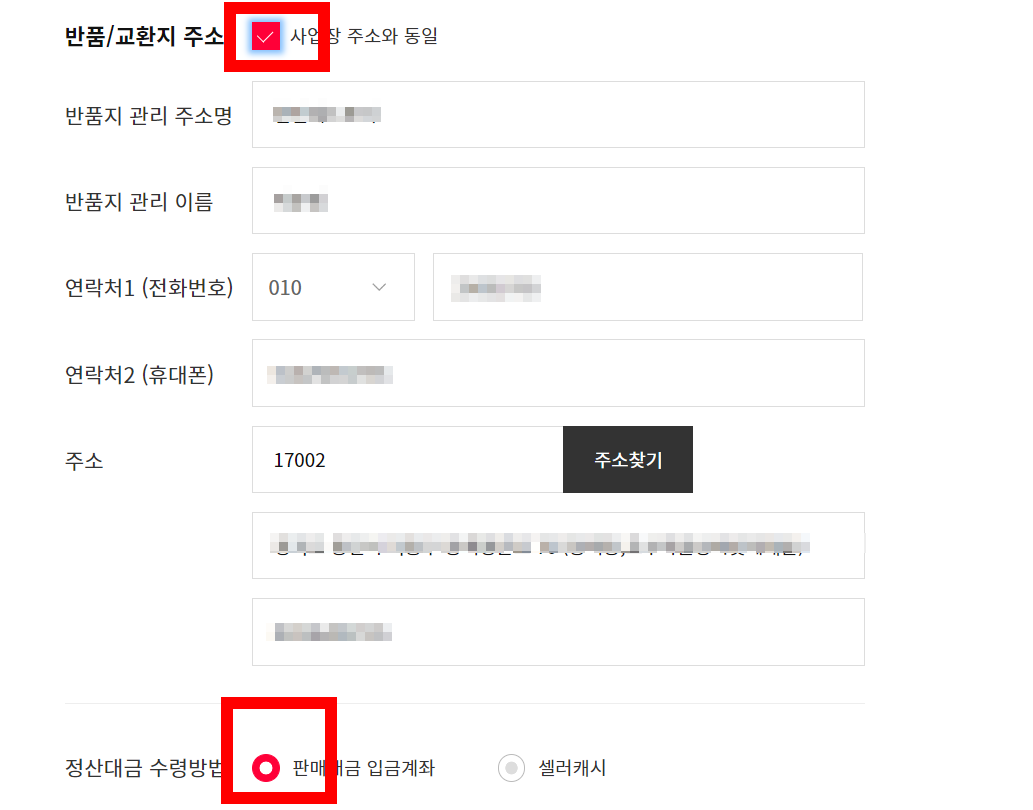 반품교환지도 사업장 주소와 동일하게 체크하고 정산대금 판매대금 입금계좌로 체크한다.