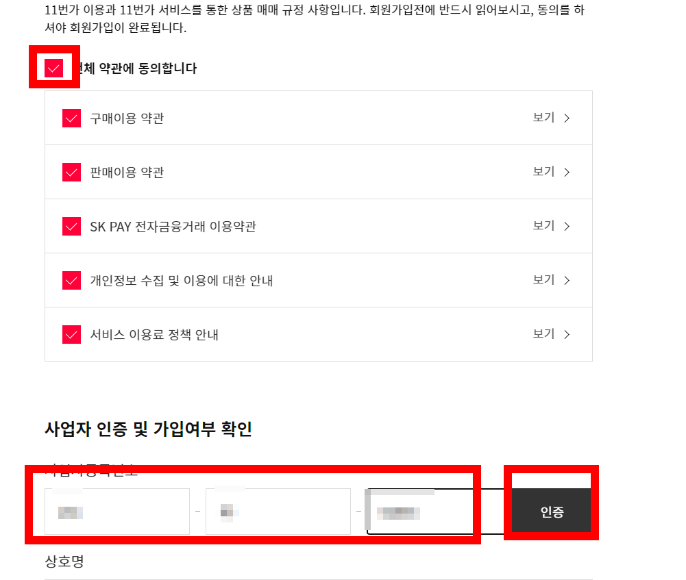 전체 약관에 동의하고 사업자 인증 및 가입여부를 확인한다.
