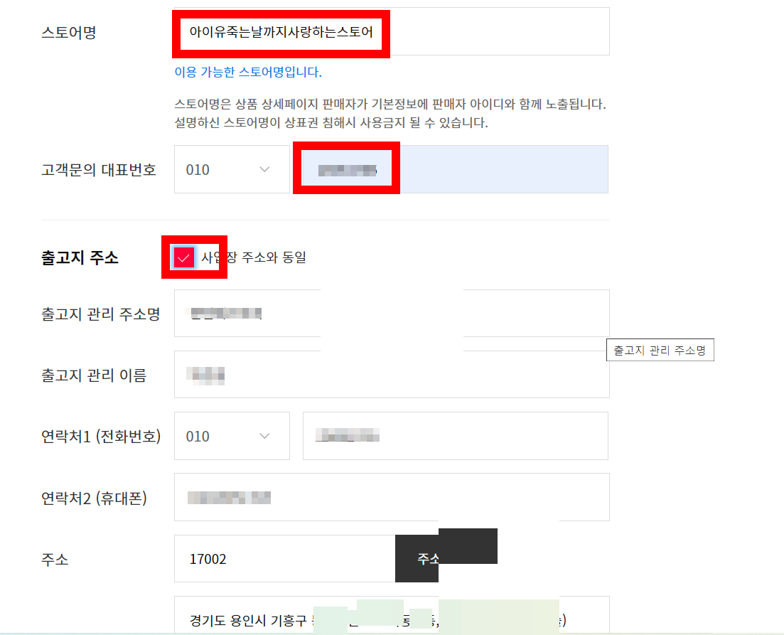 스토어명은 마음대로 넣고 출고지 주소는 일단 사업장 주소와 동일로 체크한다.