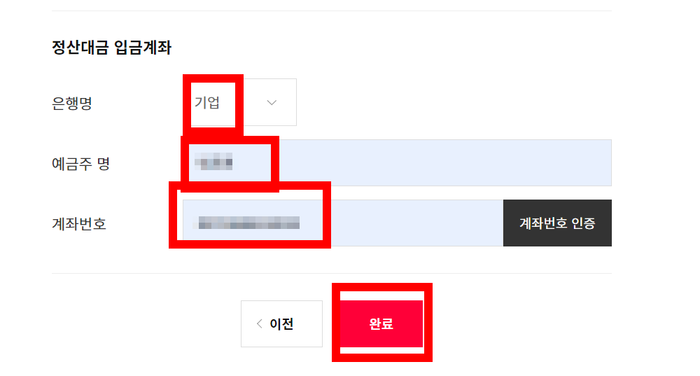 정산대금 입금계좌를 기입하고 인증한 후 완료버튼을 누른다.